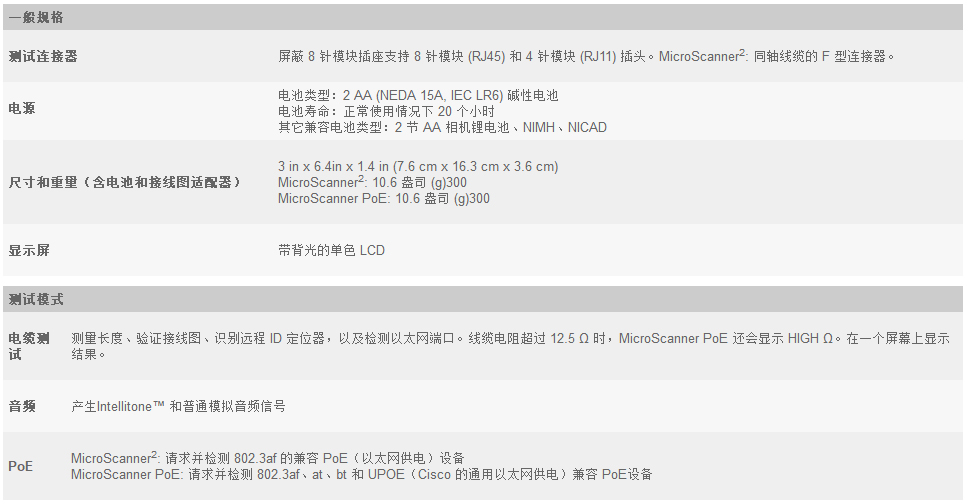 Microscanner PoE 能夠快速而方便地完成 PoE 驗證,從而解決 PoE 安裝難題。測試儀根據(jù)最新的 PoE 標準檢測連接的交換機提供的可用的 PoE 等級 (0-8),并顯示無源 PoE 源的電壓。這些信息使技術人員能夠了解安裝功能、改進工作流程,并減少等待交換機信息所需的時間。
