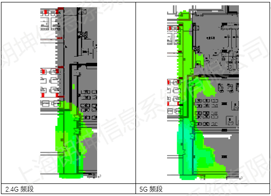 左側(cè)充電樁走廊上的AP,信號強度發(fā)現(xiàn)2.4G信號比較弱,只能覆蓋到下面區(qū)域,而5G信號能覆蓋到整條走廊。