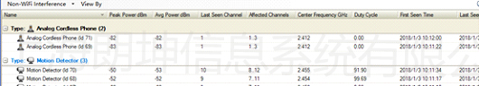 通過對每個房間的頻譜檢測,發(fā)現(xiàn)現(xiàn)場2.4G環(huán)境中存在大量的非WIFI的干擾,且存在時間比較平凡,所占信道資源也比較嚴重。其中主要的干擾源類型為MotionDetector(運動檢測器)、Microwave Oven(微波爐)、Analog Cordless Phone(模擬無繩電話),由于現(xiàn)場設(shè)備比較多,比較難以判斷具體干擾源是哪些設(shè)備產(chǎn)生的。