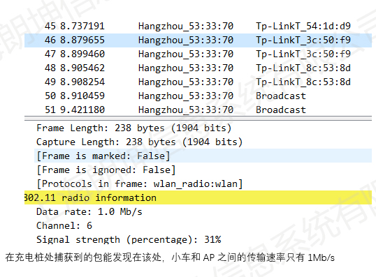 在充電樁處捕獲到的包能發(fā)現(xiàn)在該處,小車和AP之間的傳輸速率只有1Mb/s
