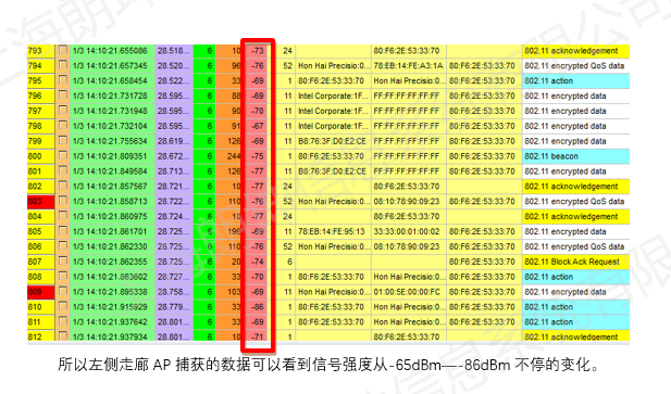 所以左側(cè)走廊AP捕獲的數(shù)據(jù)可以看到信號強度從-65dBm—-86dBm不停的變化。