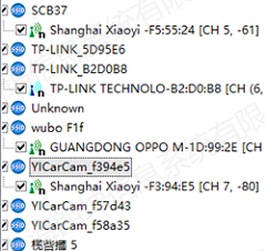 在7號房間里所說的帶有攝像頭的設(shè)備,經(jīng)過分析發(fā)現(xiàn)那些攝像頭都屬于WiFi信號,有自己的SSID,都是xiaoyi的攝像頭,且這些設(shè)備的信道規(guī)劃也不合理,有些在7信道上。如下圖