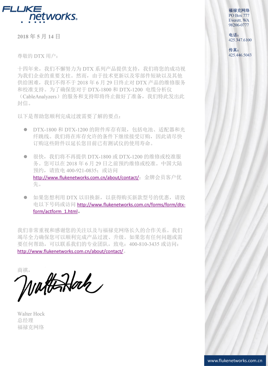 5月14日美國福祿克網(wǎng)絡(luò)公司發(fā)出由全球總裁Walter Hock先生親自授權(quán)簽名關(guān)于DTX系列產(chǎn)品服務(wù)全面停止致用戶通知函。