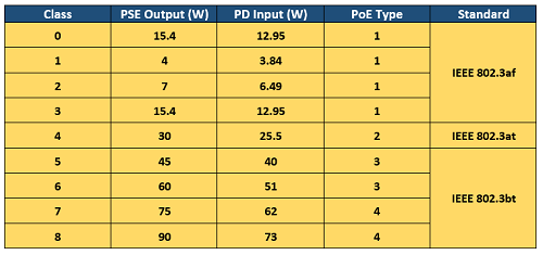 等級范圍從0到8不等,Type 1和Type 2 PoE包括0級至4級,其涵蓋的用電設(shè)備輸入功率范圍為12.95W至25.5W。Type 3包括5級(用電設(shè)備最高40W)和6級(用電設(shè)備最高51W),Type 4包括7級(用電設(shè)備最高62W)和8級(用電設(shè)備最高73W)。我們?yōu)槭裁匆值燃墸?/p>
